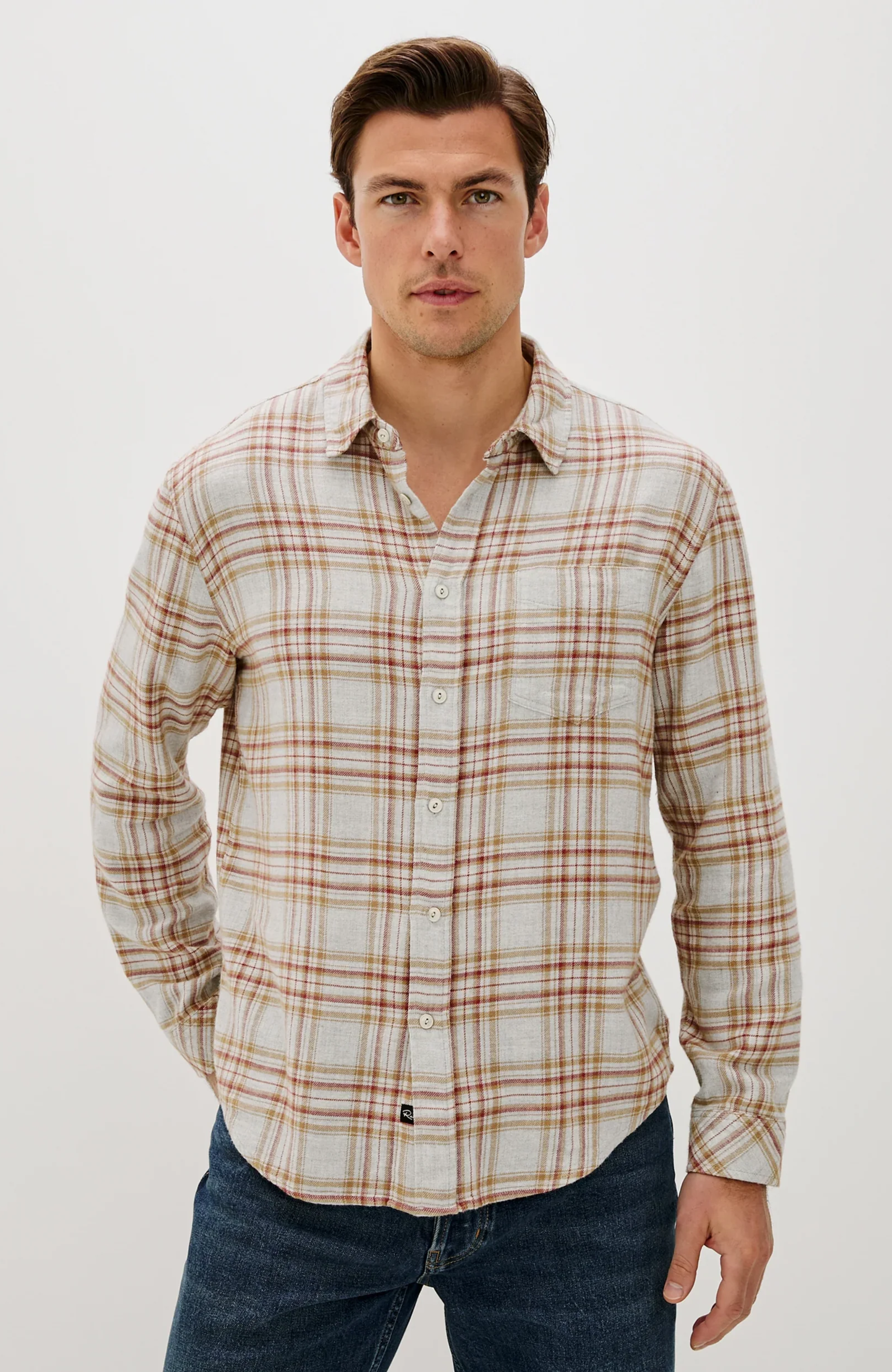 Long sleeve, traditional cotton relaxed fit plaid shirt with single pocket.