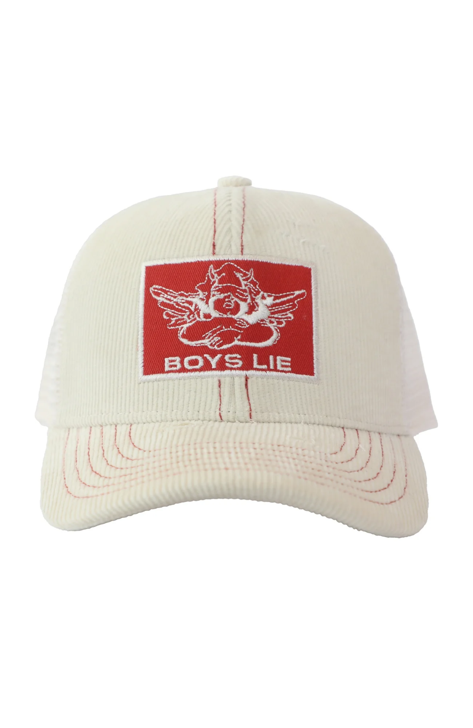 - This cream corduroy trucker hat features bold red contrast stitching and a striking front patch with the Boys Lie graphic.