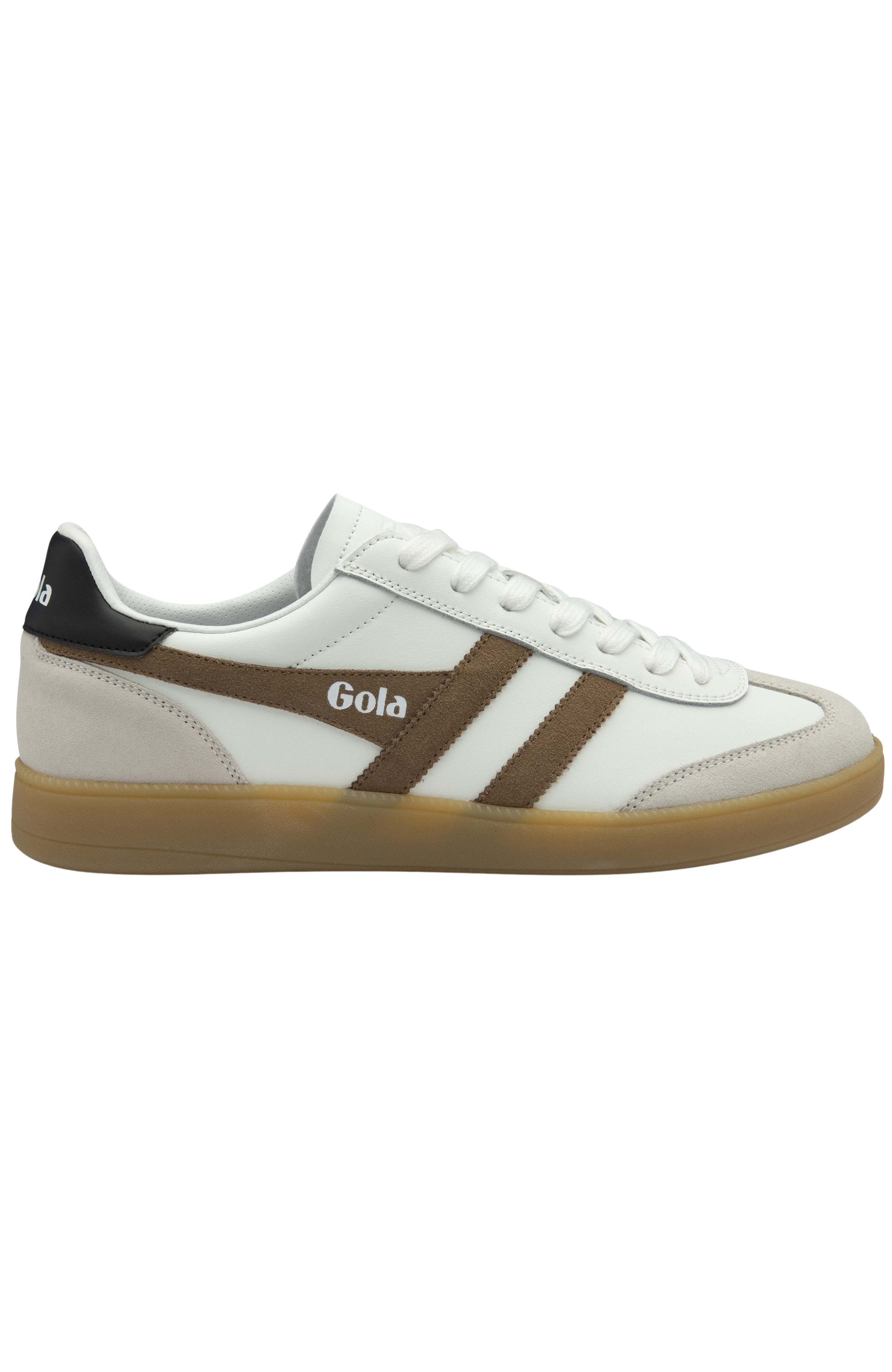 - The contrast tobacco Gola wingflash trim enhances the white leather upper, giving it a fresh aesthetic.