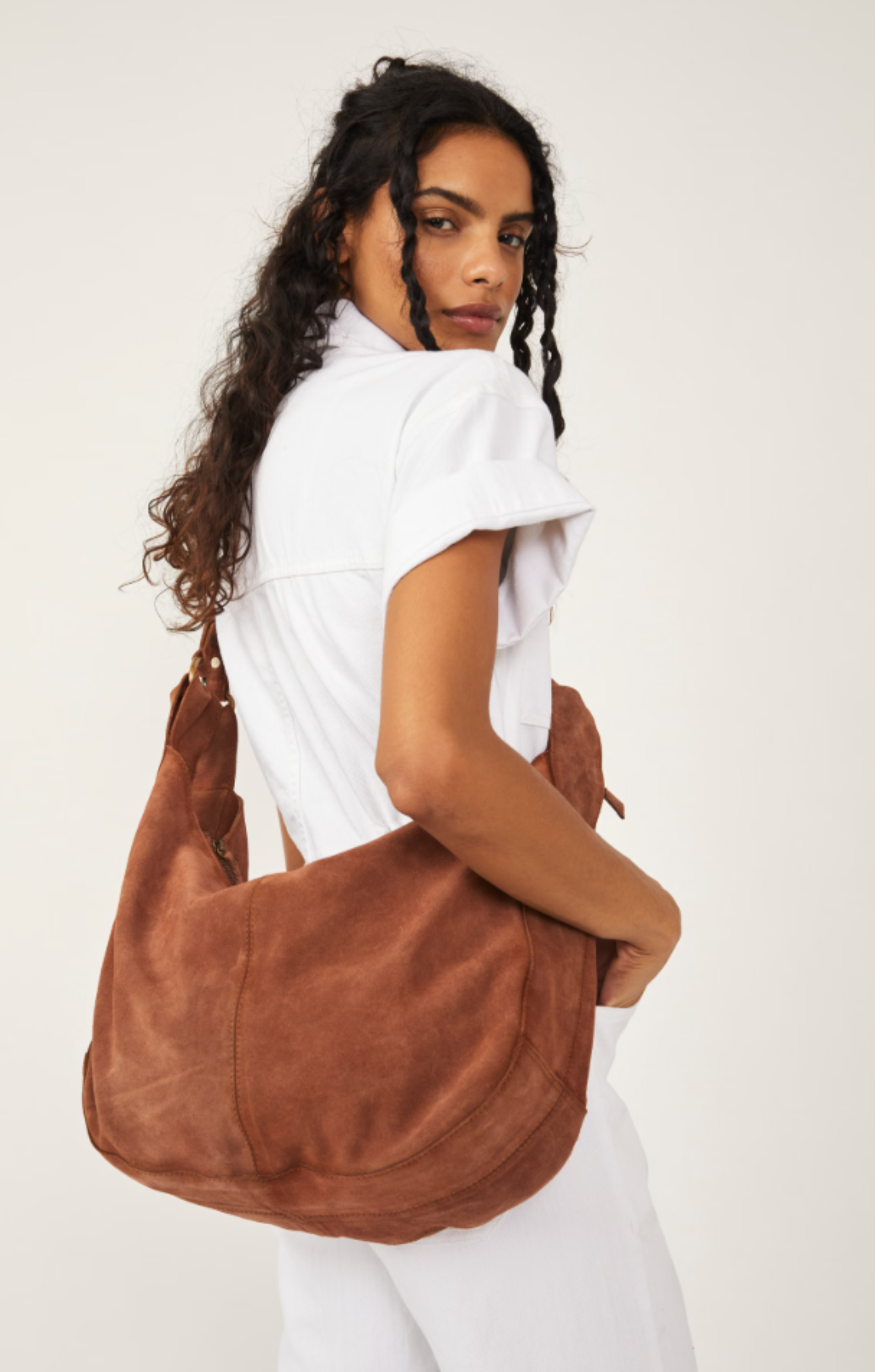 - Effortlessly functional, this tote bag is featured in a slouchy hobo style with two elongated shoulder straps, all in soft suede fabrication with zipper closure for the perfect go-to bag.