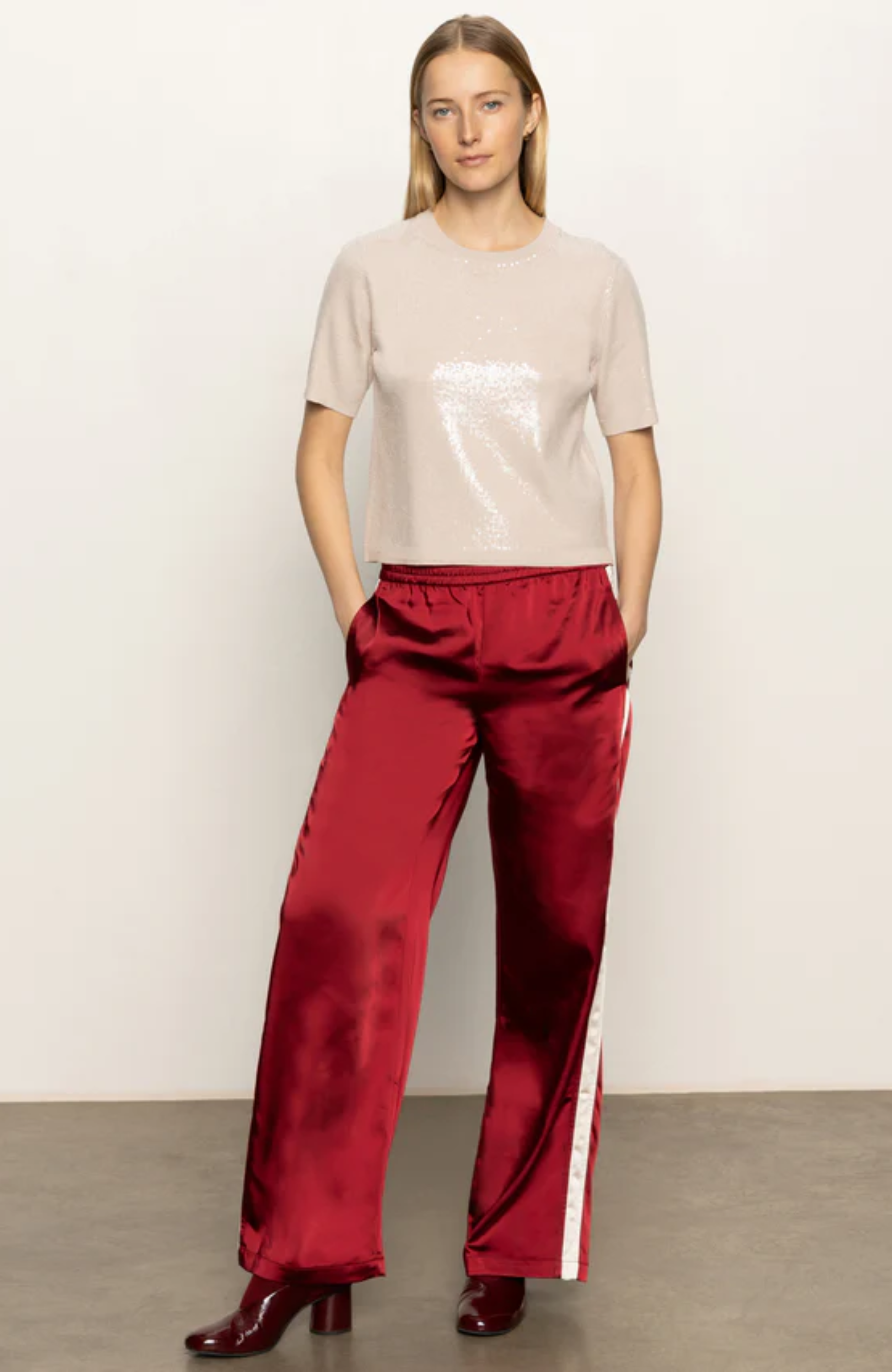 - Street style gets a glow-up with wide-legged pants cut from smooth satin and designed with a bright white stripe racing down the sides.