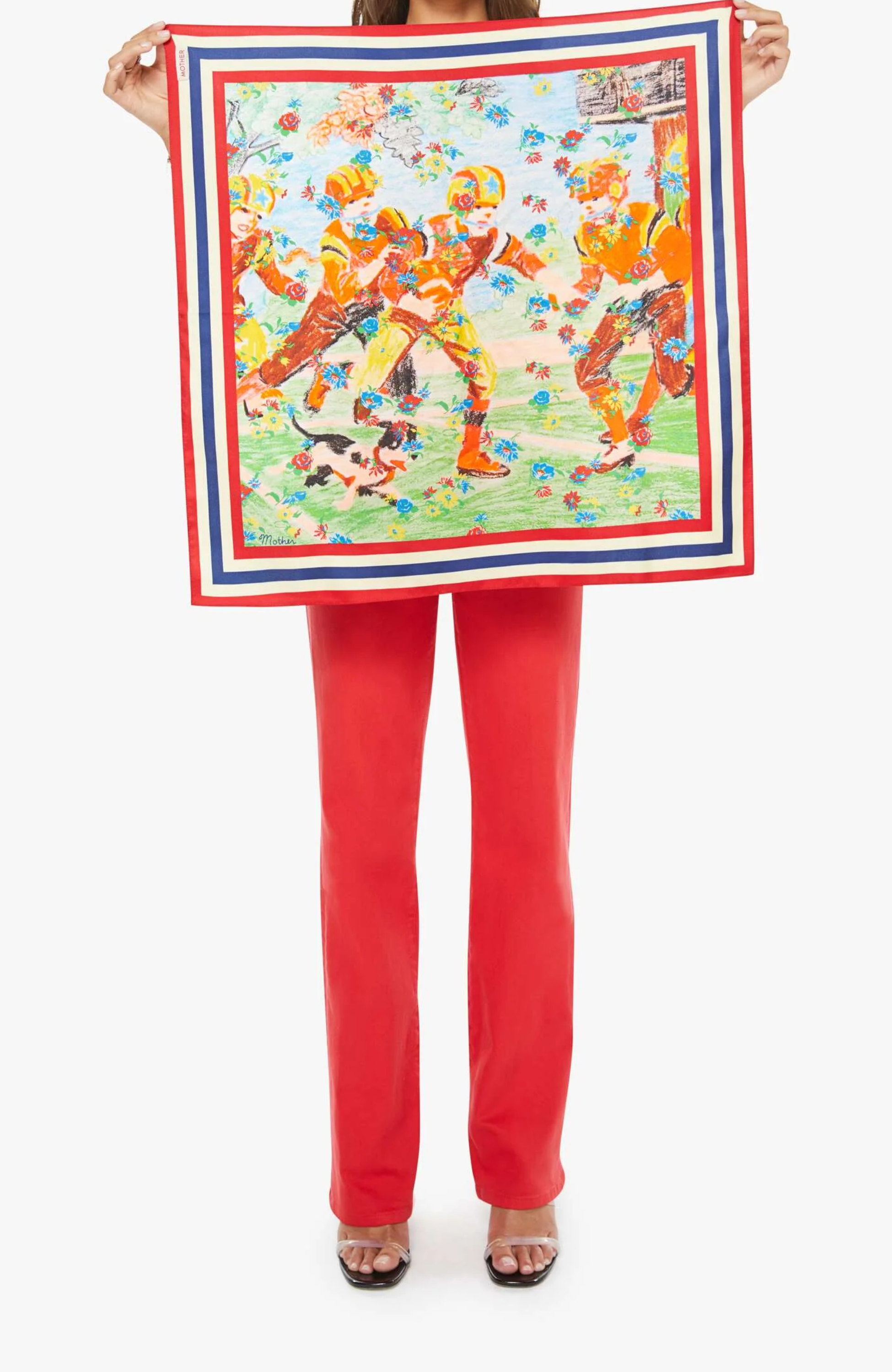 - A 25" square scarf made from 100% silk with a football-inspired graphic and red, white and blue striped trim.