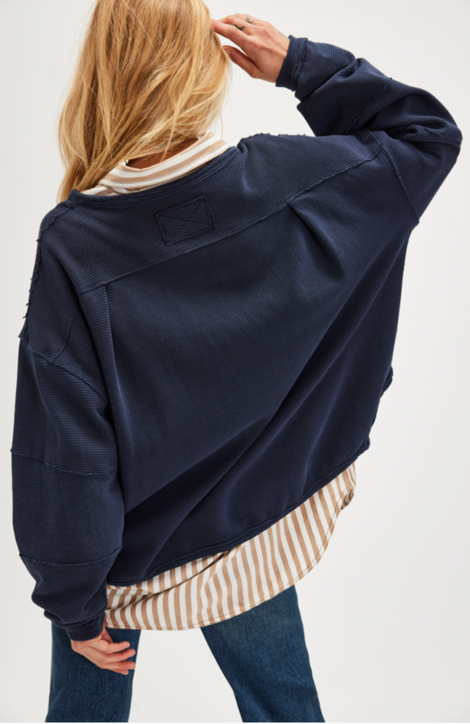Ribbed fabrication, scoop-neckline, drop-shoulder sleeves with cuffs, defined seam detailing with raw trim