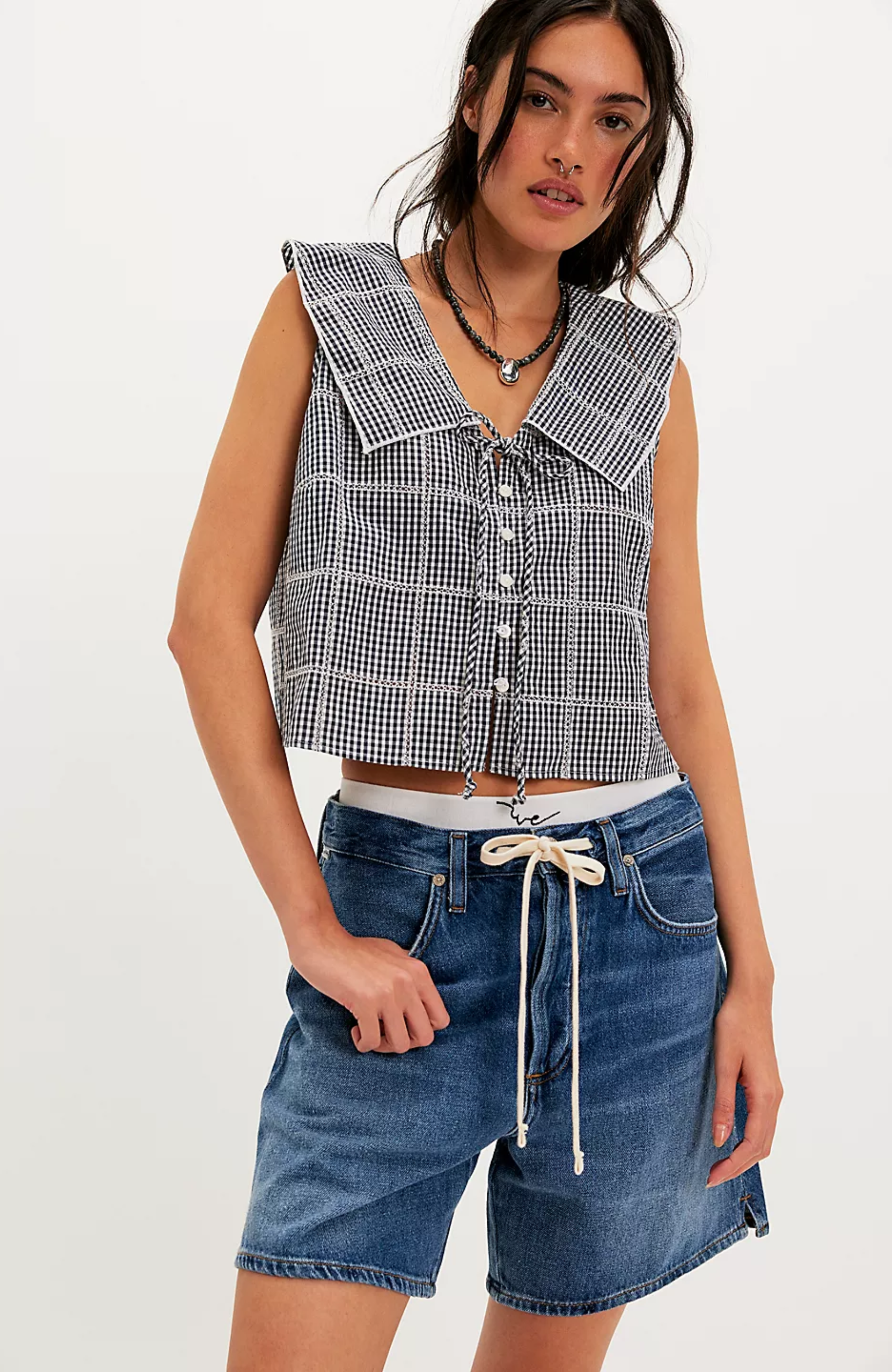 - Go retro in this plaid cropped top, featured in a sleeveless design with sprawling collar, button-front closure, and tie detail.