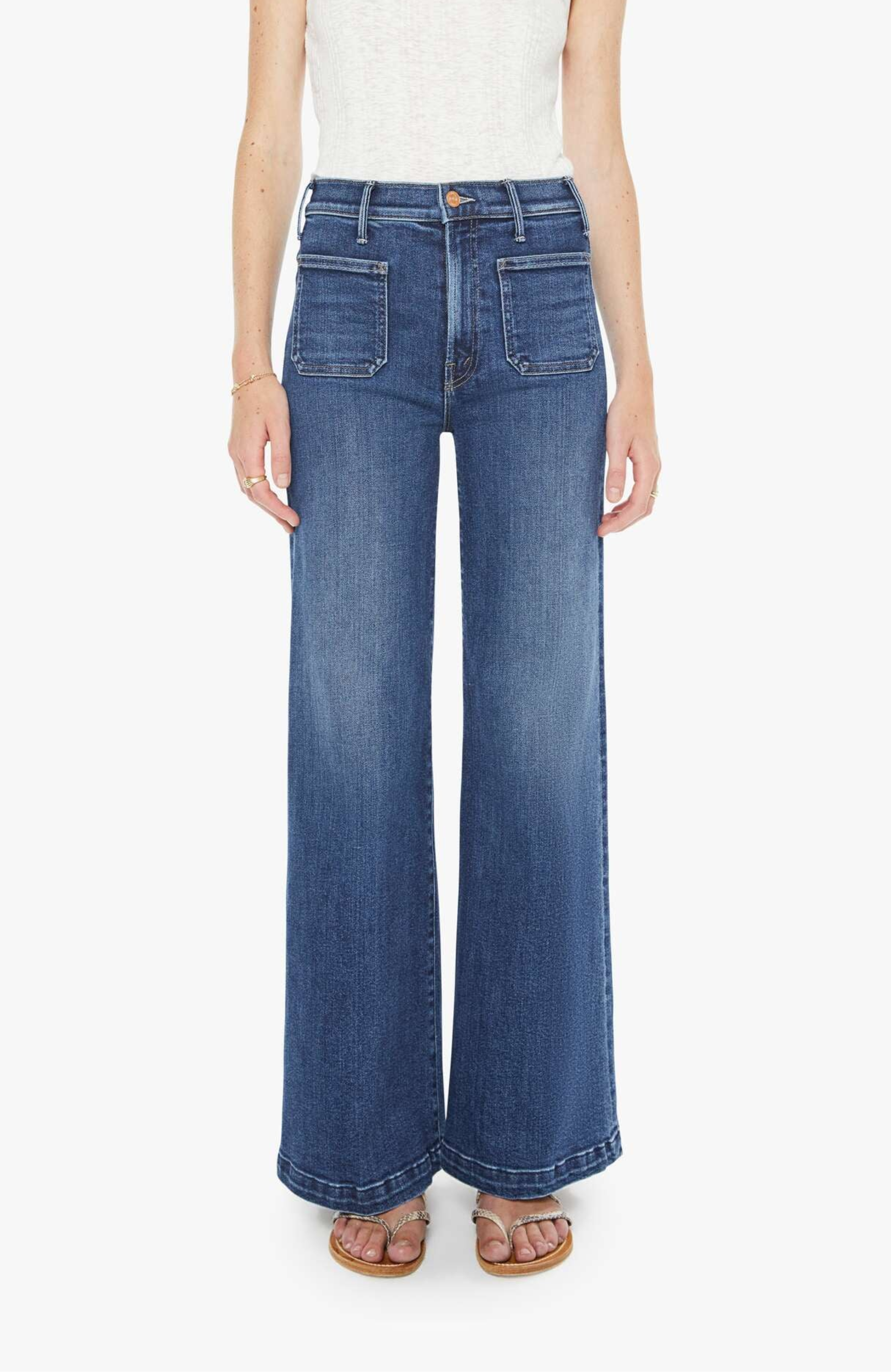 - 70s-inspired wide leg jeans with a high rise, zip fly, patch pockets, 31-inch inseam and a clean hem.