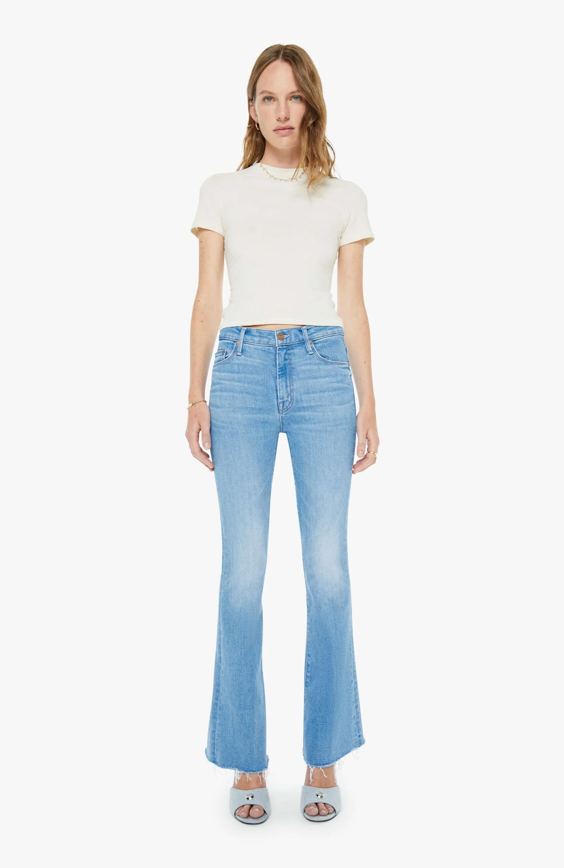 • The most popular mid-rise flare has a zip fly, 31-inch inseam and a frayed hem.