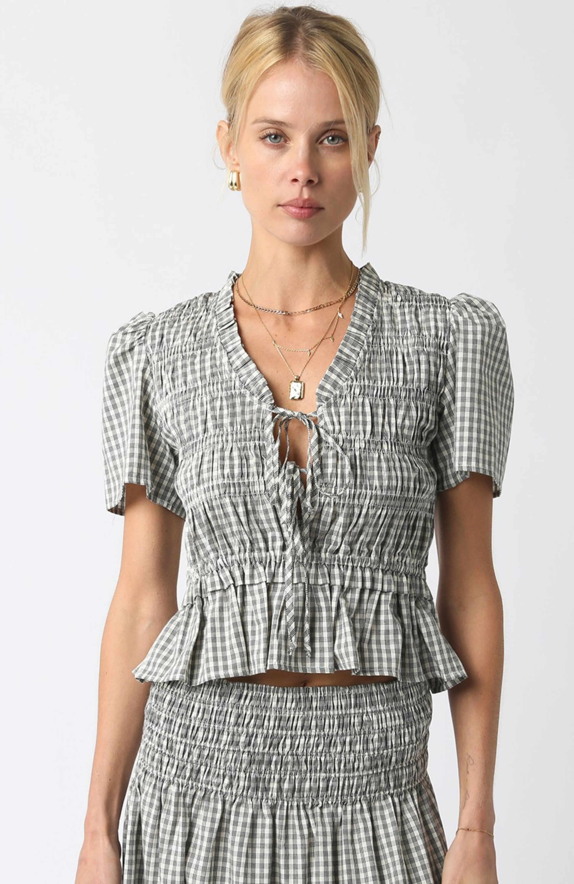 - This top features a smocked bodice with ruffle hem and puffed short sleeves add a soft, romantic touch to a look.