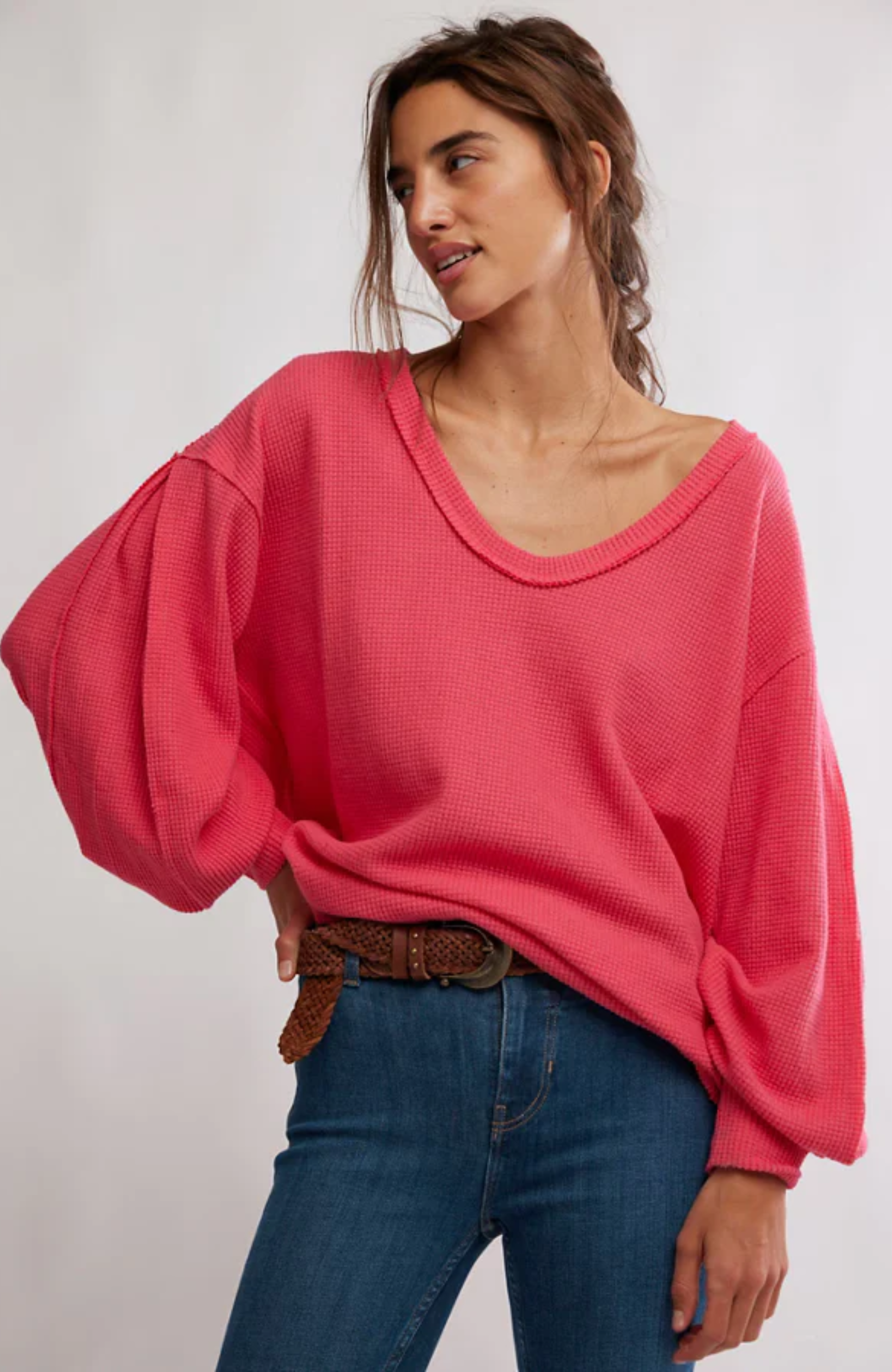 - Cozy up in this oversized thermal from We The Free, featured in a waffle knit with a V-neckline and slouchy drop-shoulder sleeves for the perfect laidback look.
