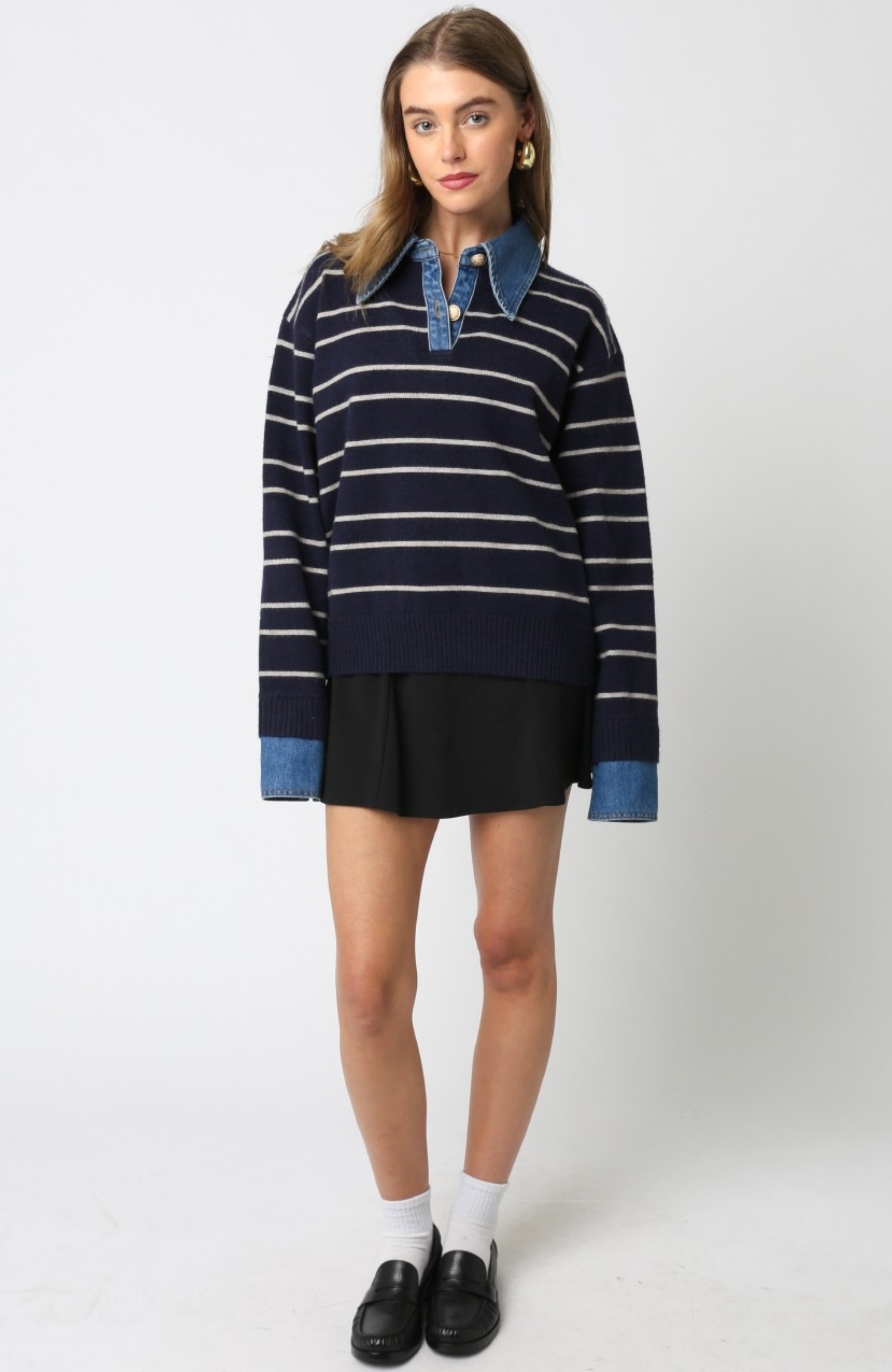 Denim Collar Striped Polo Sweater